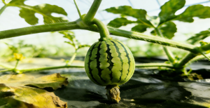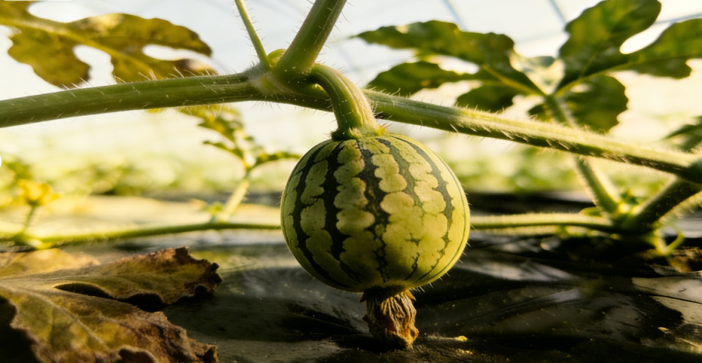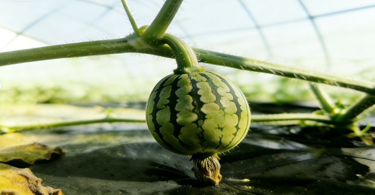 果实发育状态:植株整体通透整洁,无干枯卷须、残花残留。仅保留的1个健壮侧蔓长度稳定在26-30厘米,长出14-15片小叶,与主蔓长势协调,无任何养分争夺现象。果实直径达7.5-8.5厘米,呈标准匀称椭圆形,果皮颜色进一步加深,浅绿底色与品种特有深色条纹(或斑块)对比极为鲜明,条纹边缘规整、分布均匀且立体感增强,果皮厚度适中、韧性强劲,表面光滑洁净有光泽,商品性外观达到最佳状态;果柄依旧粗壮紧实,与茎蔓连接牢固无松动,承重能力稳定,可有效支撑果实重量,无脱落隐患;果实整体发育均衡一致,无偏心、表皮起皱、局部凹陷或斑点等畸形问题,果肉开始积累糖分,果实质地逐渐紧实。