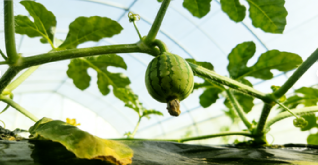 藤蔓与茎叶形态:植株株高稳定在50-55厘米,茎秆基部直径达2.3-2.5厘米,基部木质化程度充分,质地坚硬且稳固性强,中上部茎秆柔韧有弹性,可稳定承载果实重量,主蔓长度保持在67-72厘米,节间长度维持4-5厘米,生长完全停滞,无茎秆开裂、徒长或养分失衡等问题。叶片已展开21-23片掌状裂叶,叶面积小幅下降,中下部4-6片老叶黄化程度进一步加深,部分老叶边缘出现轻微干枯,属正常营养回流现象;中上部功能叶依旧浓绿厚实、光合效率稳定,是果实养分供给的核心载体;叶面绒毛细密完好,可有效减少水分蒸发与病虫害附着,保障光合作用持续高效运转