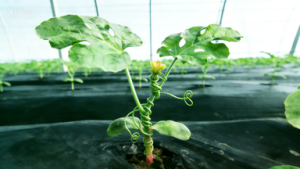 2. 附属结构与花芽发育:叶腋处卷须呈紧密螺旋状,攀附能力强劲,可自然缠绕支架或垄边固定藤蔓,部分卷须已缠绕相邻植株支架形成稳定支撑。侧芽萌发集中在第6-10节位,健壮侧蔓长度可达8-12厘米,长出4-5片小叶,长势与主蔓协调性良好,无喧宾夺主现象。多数植株第8-14节叶腋处的雌花雏形进一步膨大,直径达0.5-0.8厘米,花瓣原基清晰可见,部分雌花已显露出柱头雏形;雄花原基膨大成熟,形成饱满的小花蕾,直径约0.3-0.5厘米,部分长势健壮的植株,雄花蕾已临近露瓣状态,花芽分化质量优良。