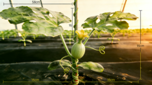 叶腋处卷须多数已干枯,仅上部少量卷须保持鲜活并缠绕支架,为植株提供稳固支撑,干枯卷须可及时清理,减少养分无效消耗。侧蔓(仅保留1个健壮侧蔓)长度稳定在18-22厘米,长出9-10片小叶,与主蔓长势协调,无养分争夺现象。授粉后的幼果膨大显著,直径达3.5-4.0厘米,呈标准椭圆形,果皮浅绿色加深、表面光滑无褶皱,果柄粗壮且与茎蔓连接紧实,承重能力进一步提升,部分幼果表面已隐约显现品种特有纹理雏形;田间无未脱落残花,减少了病害滋生隐患