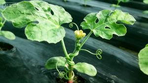 藤蔓与茎叶形态:植株株高稳定在38-43厘米,茎秆基部直径达1.5-1.7厘米,基部淡红色晕染深厚且质地坚韧,中上部茎秆柔韧有弹性,主蔓长度延伸至45-50厘米,节间长度保持在4-5厘米,无徒长、节间过密或茎秆细弱等问题,生长节奏趋于平稳。叶片已展开13-15片掌状裂叶,叶面积达到阶段性峰值,中下部叶片浓绿厚实、光合效率稳定,上部新生叶片鲜嫩舒展,叶缘锯齿清晰,叶面绒毛细密,整体光合系统可高效供给花芽成熟与藤蔓后续生长所需养分。