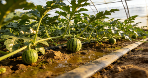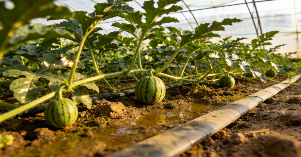 果实大小、果皮形态完全定型,果皮条纹清晰规整,蜡质层厚度达到峰值,触感光滑有质感,果肩、果脐部位饱满对称。果肉转色基本完成,中早熟品种果肉多呈现均匀的粉红色/深红色,中心糖度持续攀升,边缘糖度与中心糖度差值逐步缩小;瓜柄木质化明显,基部茸毛完全脱落,果柄与果实连接处略微收缩,果脐处绒毛稀疏,符合成熟果实的典型特征。