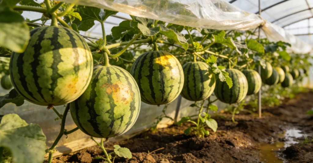 此阶段西瓜果实已进入快速膨果后期,即将进入糖分积累期,坐果部位集中在主蔓第12-15节,每株保留1-2个健壮果实,果实分布均匀,无畸形果、小果现象。单个果实纵径约28-32cm,横径约22-25cm,单果重可达3.5-4.5kg,果实表皮光滑,颜色由浅绿逐渐转为深绿,果皮上的条纹清晰分明,条纹颜色加深(依品种不同,条纹形态、颜色略有差异),果皮厚度均匀,约1.0-1.2cm,无裂果、空心、畸形等问题。