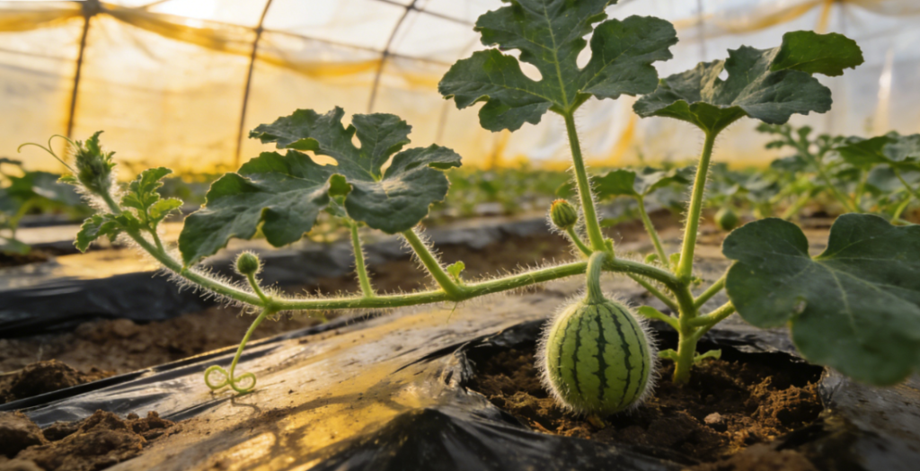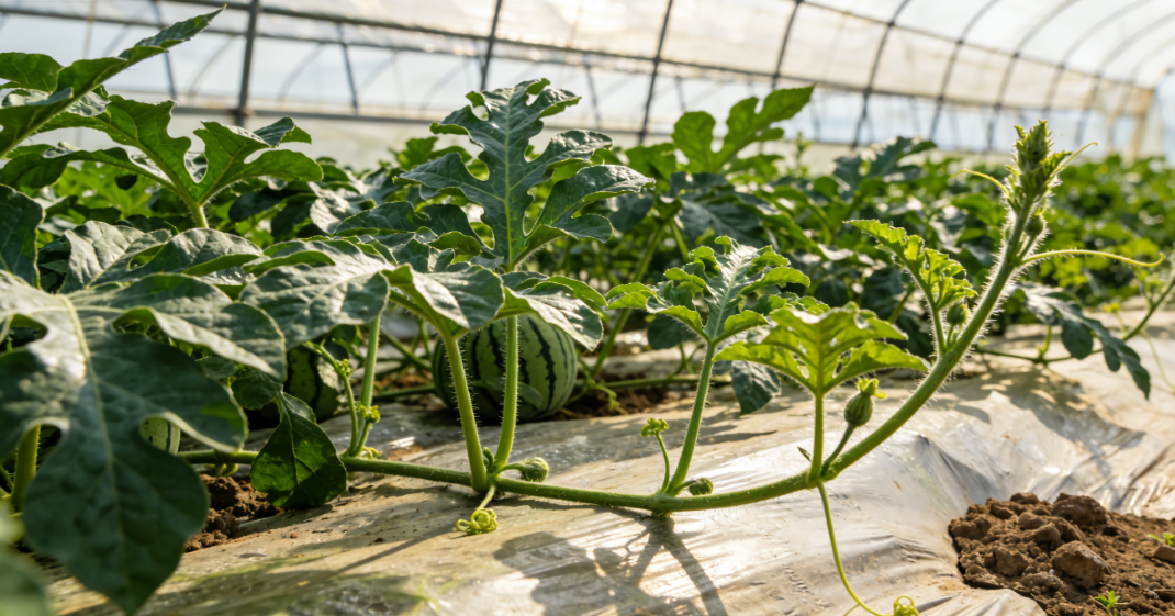 此阶段西瓜苗主蔓生长旺盛,长度通常可达1.2-1.8米,具体因品种、水肥条件略有差异。主蔓节间长度稳定在8-12厘米,节间粗壮且节部突出,触摸有韧性,无徒长(节间过长、茎秆纤细)或生长停滞现象。侧蔓已萌发3-5条,以第2-3条侧蔓长势最强,长度可达50-80厘米,侧蔓节间结构合理,能为后续辅助结果或养分供给提供支撑。藤蔓表面绒毛浓密,叶绿素含量充足,茎秆呈深绿色,无发黄、萎蔫或机械损伤痕迹,卷须粗壮且伸展有力,可正常附着支撑物,辅助藤蔓攀爬生长。