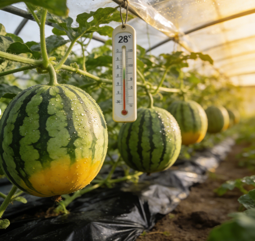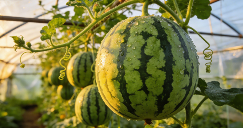 每株保留1个健壮果实,果实已进入快速膨果期,果形规整,呈椭圆形(或圆形,根据品种调整),无畸形、裂果、空心迹象。果实横径约18-22cm,纵径约25-30cm,单果重量达到2.5-3.5kg,果实表皮光滑,色泽由浅绿逐渐转为深绿(或对应品种特有底色),表皮条纹清晰分明,条纹颜色加深,果皮厚度约0.8-1.0cm,质地紧实。果实内部果肉开始由白色转为淡粉红色(或品种对应果肉色泽),糖分初步积累,口感已有轻微甜味,果实悬挂牢固,无脱落风险,膨大速度较前10天略有放缓,但仍处于稳步增重阶段。