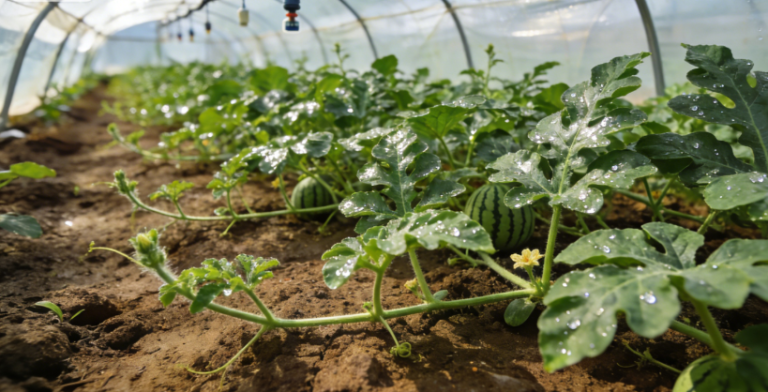 整枝绑蔓:此时大棚内已完成整枝(单蔓 / 双蔓 / 三蔓整枝)和绑蔓作业,藤蔓沿吊绳或地面定向伸展,无缠绕、徒长现象